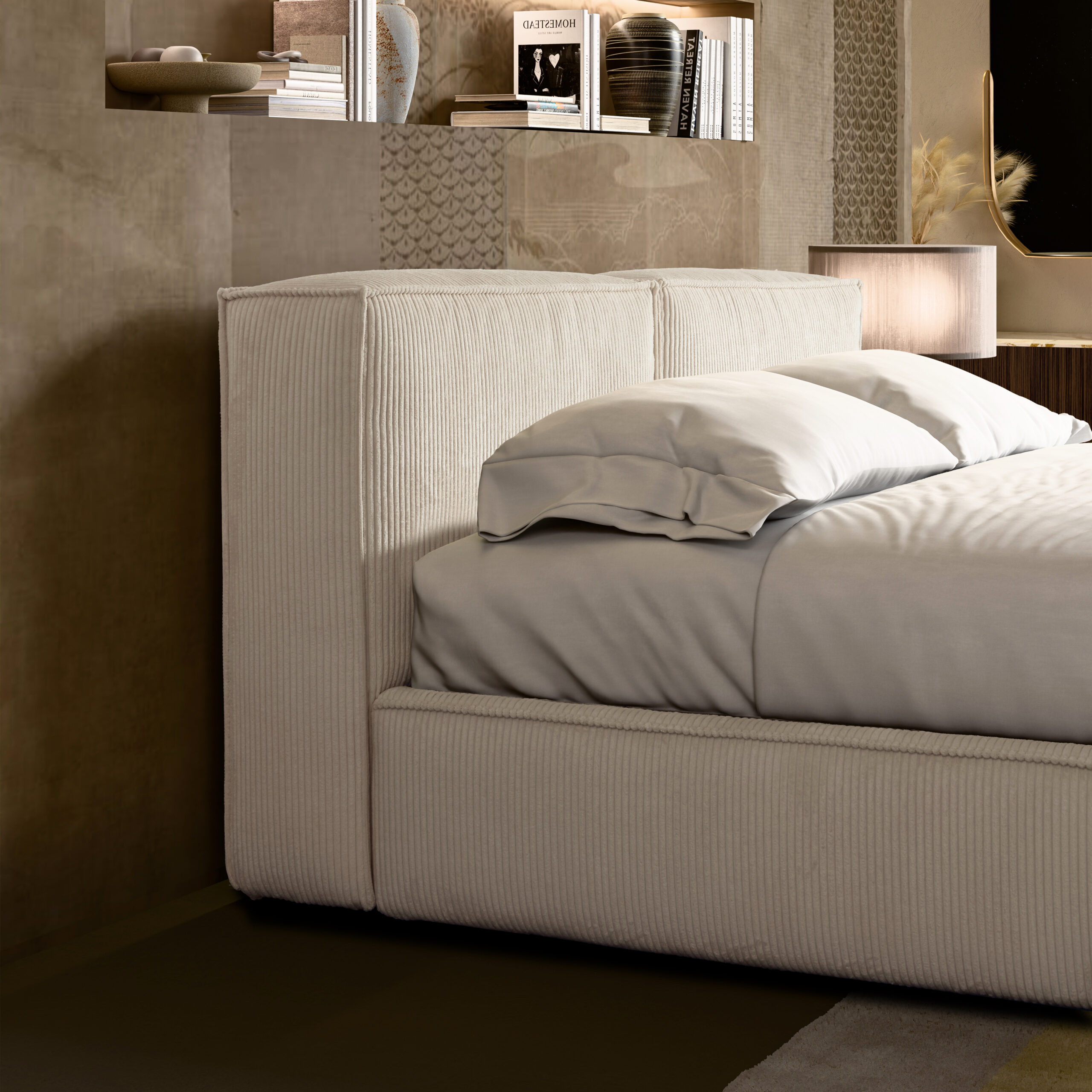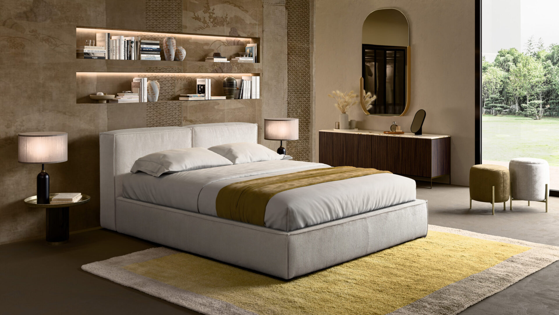 Il letto Takao nasce dall’incontro tra minimalismo orientale e accoglienza contemporanea. Le sue forme morbide e la testiera divisa in due comodi cuscini imbottiti invitano al relax, mentre il rivestimento in velluto millerighe dona calore e raffinatezza all’ambiente.