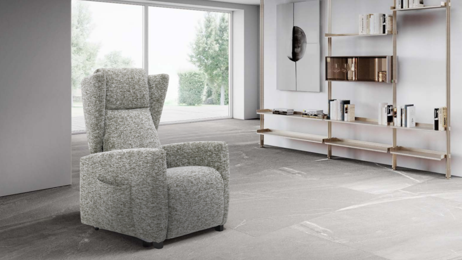La posizione TV o lettura in cui lo schienale resta in posizione perpendicolare alla seduta e la pediera si apre per garantire comodità alle gambe. Questa posizione è prevista anche con meccanismo ad 1 motore, grazie alla funzione anticipo pediera.